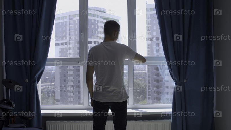 Молодой человек стоит возле окна в комнате с голубыми шторами СМИ Мужчина чего-то ждет, смотрит на часы