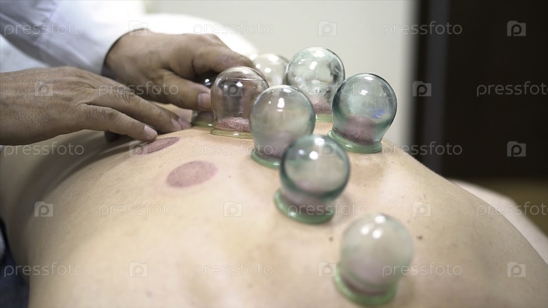 Закрыть для нескольких вакуумных чашек, медицинская терапия всасыванием на человеческом теле, оздоровление, концепция здоровья тела.Врач снимает чашки с спины пациента, оставляя следы крови, китайская терапия всасывания