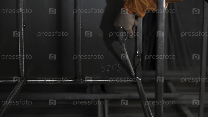 Продувание воздуха на металлические детали перед покраской в порошок. Клип. Работник с защитным оборудованием очищает металлическую конструкцию, прежде чем красить их. Алюминиевая пылесосильная пушка для проветривания пистолета Clean Handy Tool