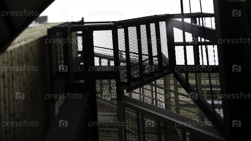 Пожарный побег в темной аллее. видеозапись. типичные аварийные лестницы из старого здания. пожарный выход