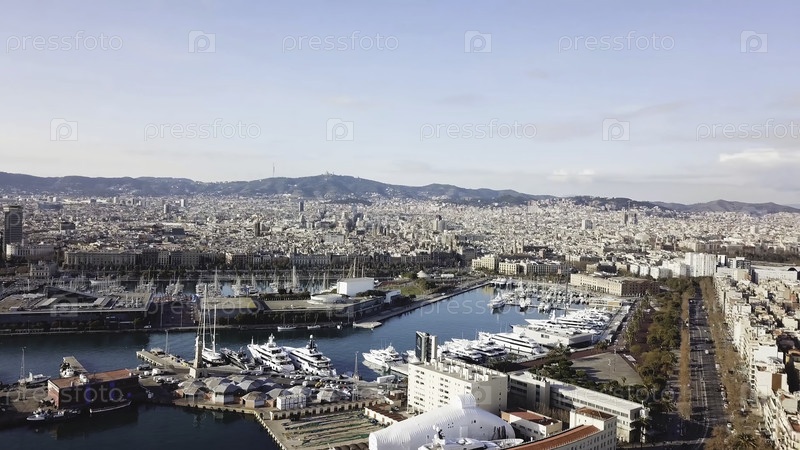 Вид сверху города с бухтой и яхтами. Сток. Прекрасный вид из воздуха на городской порт. Вид из воздуха на белые яхты и лодки, пришвартованные в портовом пирсе