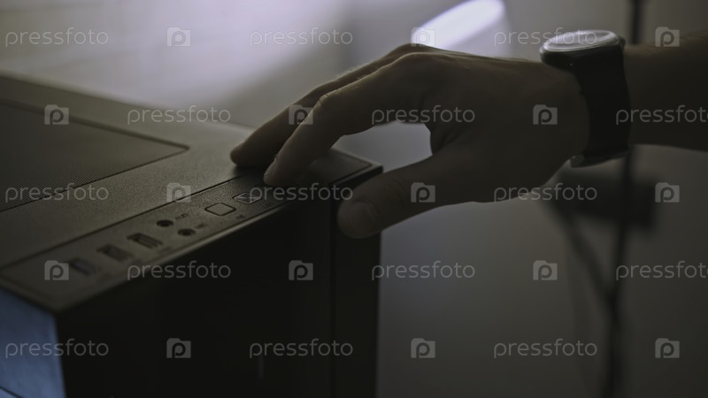 Ближайший снимок человека, нажимающего кнопку запуска компьютера. Клип. Человек включает современный компьютер. Игровой профессиональный ПК с красивым дизайном