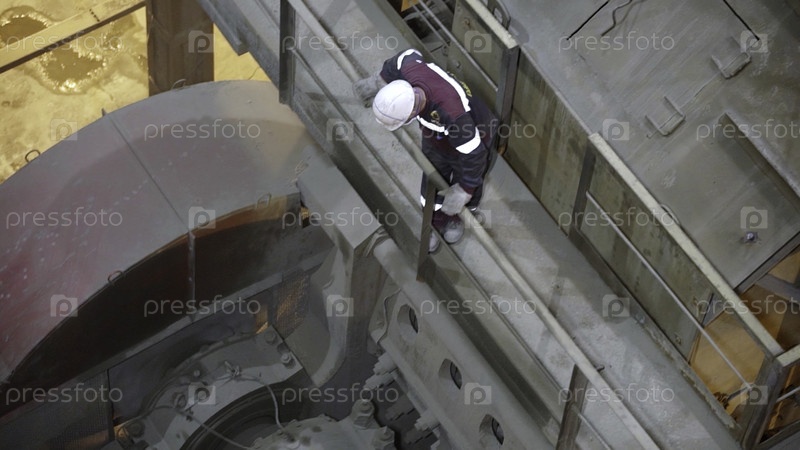 Промышленный работник, оснащенный защитным снаряжением, осторожно перемещается по оживленной строительной зоне