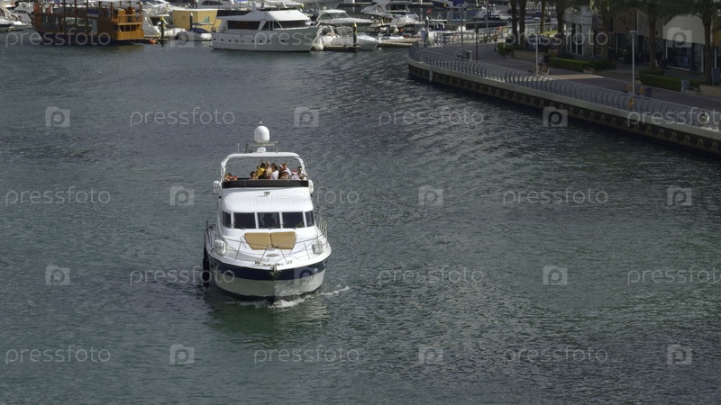 Дудай, ОАЭ - 9 мая 2023 года: вид яхты с туристами и канал. Действие. Люди на борту развлекаются во время отпуска