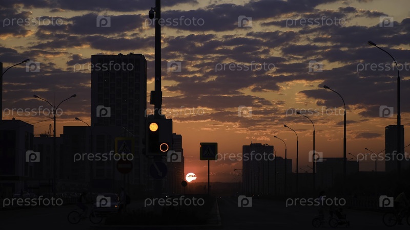 Удивительное розовое и оранжевое небо с ярко-красным сияющим солнцем, восходящим над темным городом с ходящими людьми и едущими автомобилями