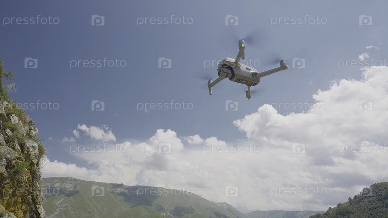 Квадрокоптер, летящий на фоне гор и неба. Действие. Профессиональный квадрокоптер для съемки во время путешествия. Квадрокоптер поднимается в воздух и фотографирует горные пейзажи