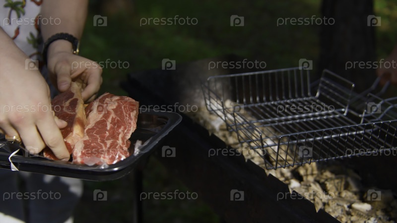 Близкий план человека, жарящего кусочки красного мяса. Скриншоты. Человек готовит два куска говядины или свинины на гриле. Мужчина готовит мясо на гриле в природе летом