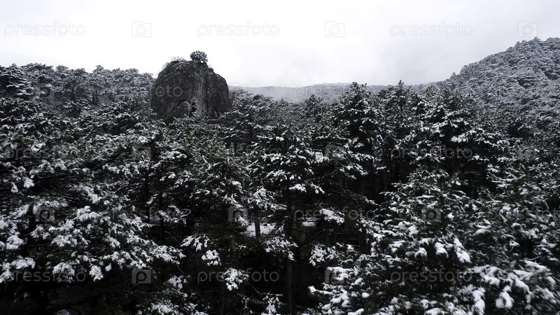 Горный лес из хвойных деревьев. выстрел. покрытые снегом пихтовые вершины. солнечная погода в горном ущелье зимой