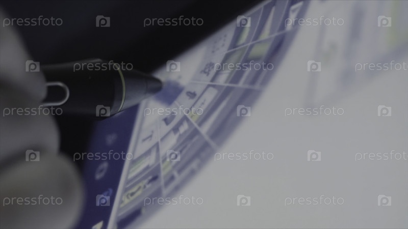 Графический дизайнер работает с планшетом и ручкой в офисе. Близкий контакт художника, рисующего портрет длинношерстного подростка