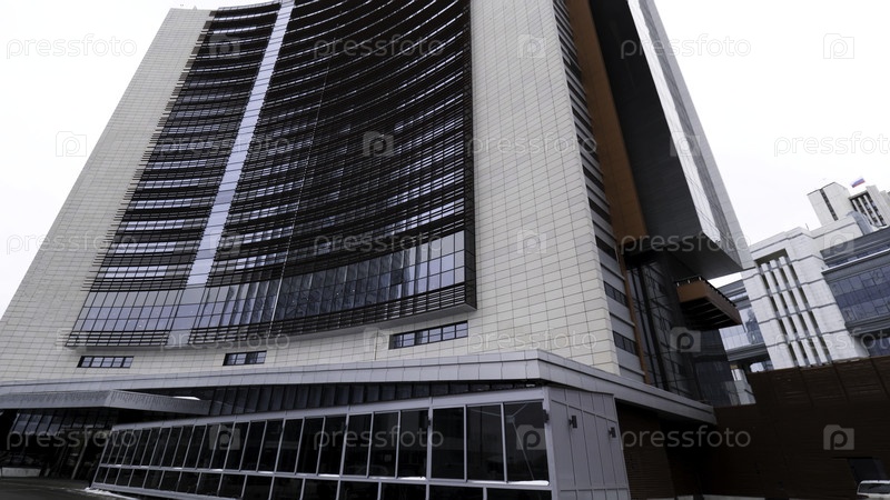 Современный высокий бизнес-центр или многоквартирное здание с множеством окон на ярком фоне неба. Снимок из фондов. Нижний вид захватывающего дух необычного фасадного здания, архитектурная концепция