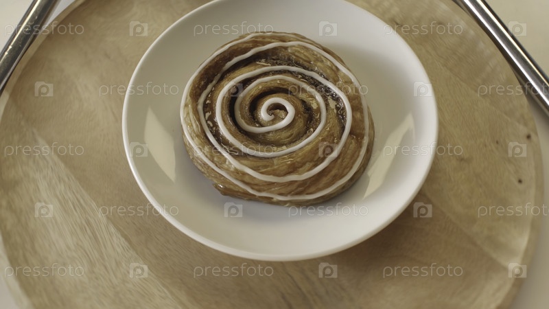 Концепция пекарни и кондитерских изделий. Стоковые кадры. Вкусные сладкие бублики с медом и белым глазурем, лежащие на белой тарелке и вращающиеся на деревянной круглом доске