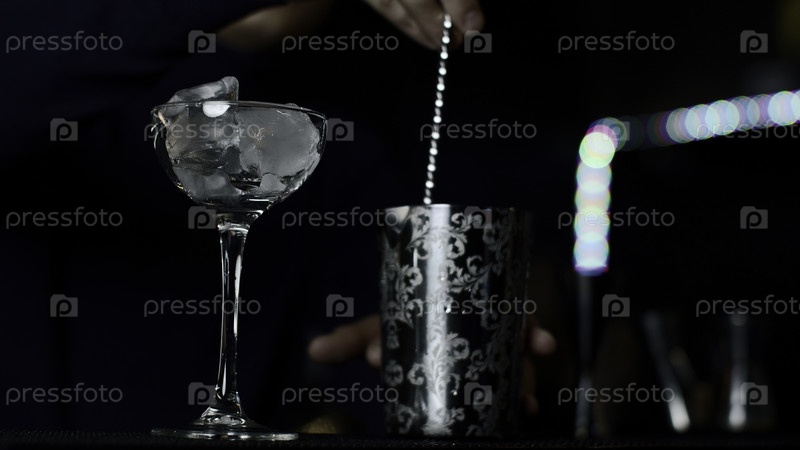 Близкий снимок бармена - это смешивание алкогольного коктейля в баре или дискотеке.СМИ.Процесс приготовления спиртного напитка