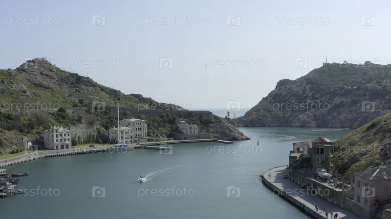 Красивая бухта с голубой водой и старым городом. Действие. Вид сверху на красивую бухту с приморским городком и крутыми скалами. Прекрасное побережье к югу от Крыма