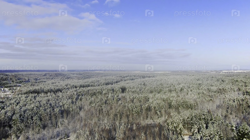 Летать над белыми еловыми деревьями, покрытыми свежим снегом в солнечный зимний день. Движение. Смешанный лес после снегопада в потрясающую зиму. Глубокий заснеженный зимний лес