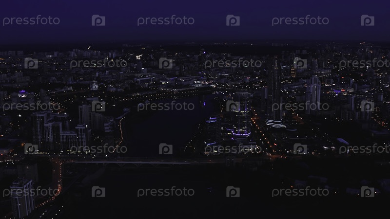 Вид с вершины красивого ночного города со современным освещением. Скриншоты. Пейзаж ночного города с рекой и высотными зданиями. Светящийся ночной город в прекрасном небесном горизонте