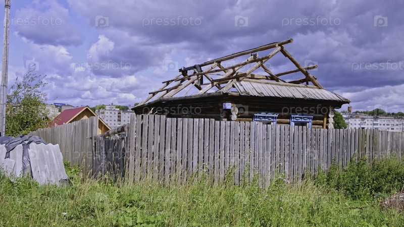 Заброшенные дома на фоне жилых зданий. Клип. Заброшенные здания в деревне на фоне жилых многоэтажных домов. Контраст бедного района с заброшенными и жилыми зданиями