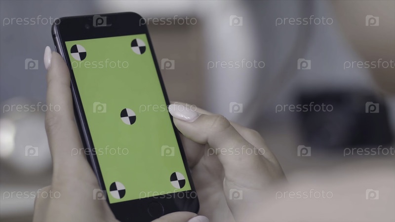 Ближайший план рук молодой женщины с идеальным маникюром, которая держит смартфон и скользит по зеленому экрану клавиши Chroma