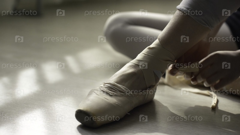 Танцовщица, завязывающая обувь балета перед тренировкой