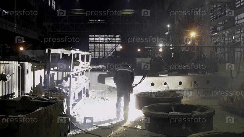 Промышленный рабочий усердно участвует в действиях во время ночных часов на фабрике