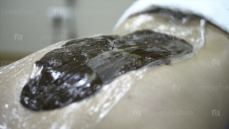 Близкий контакт для пациента, лежащего в постели с горячей терапевтической грязью на спине, концепция альтернативной медицины. мужская спина с горячей жидкой смесью трав, покрытой белым полотенцем, процедура оздоровления