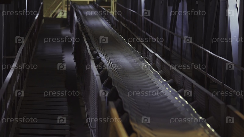 Конвейерная лента на заводе по производству строительных материалов. Закрытие производственной линии небольшими измельченными камнями или гравием