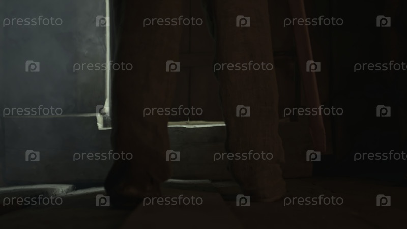 Сзади взгляд старые ноги медленно движутся к старой деревянной двери.Медиа.Старик, идущий внутрь и держащий в руках деревянную палку