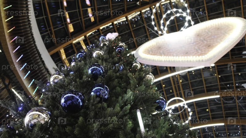 Вид снизу на высокую рождественскую елку, украшенную синими и серебряными шарами и гирляндами красочных огней, стоящих в каком-то здании