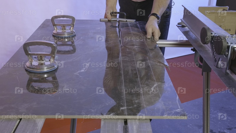 Плотник режет плиточную доску.Креативно.Человек ломает даже часть нарезанной плитки.Разрезание плиточной доски в современной столярной студии