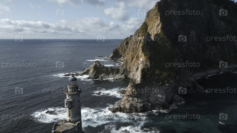 Вид сверху драматического пейзажа скалистого острова и маяка в море.Клип.Кинематографический сказочный ландшафт скалистого мыса и маяка в океане.Волшебный пейзаж скал и заброшенного маяка в океане в солнечный день
