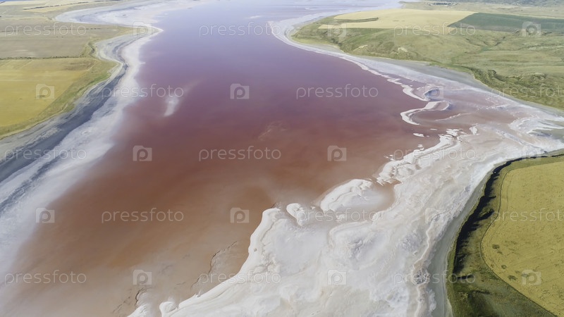 Потрясающий вид с воздуха на необычное розовое озеро, окруженное зелеными лугами, цветами природы