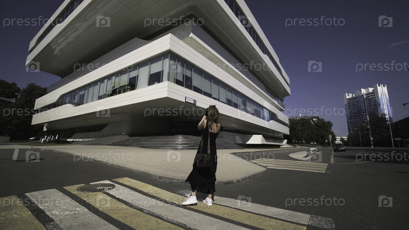 Amazing Dominion Tower, бизнес-центр, расположенный в Москве, Россия.Концепция современной архитектуры, женщина с камерой фотографирует здание