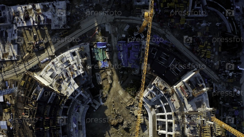 Процесс строительства стадиона, вид сверху. Строительная площадка, создание металлических конструкций во время строительства стадиона