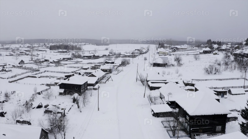 Вид с воздуха снежно покрытых крыш деревянных домов. Клип. Небольшая зимняя деревня на фоне тяжелого облачного неба