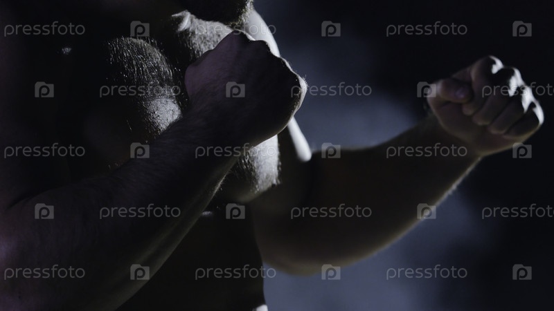Боксер с сильными руками и зажатыми кулаками на черном фоне. Близкий план руки бокса, готового к бою