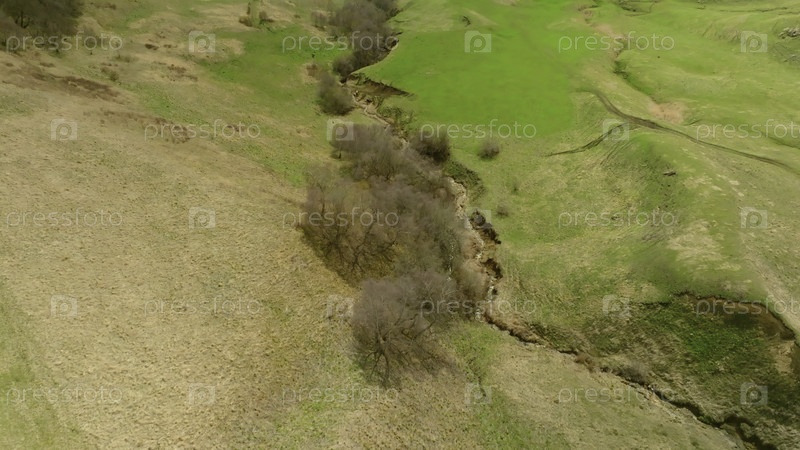 Вид сверху красивого рельефа склона с зеленой травой. Снимок. Зеленый склон с рельефом высохших рек в солнечный летний день. Летний пейзаж со зеленой травой и горный склон с рельефом высушенных водотоков