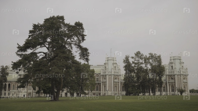 Большой дворец в парке Царицыно в Москве с зеленой лужайкой. действие. удивительный зеленый парк и историческое здание под тяжелыми облаками в туманную погоду
