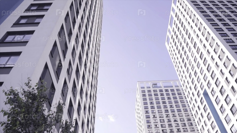 Нижний вид жилых зданий с голубым небом. Рамка. Нижний вид фасада современного многоэтажного дома