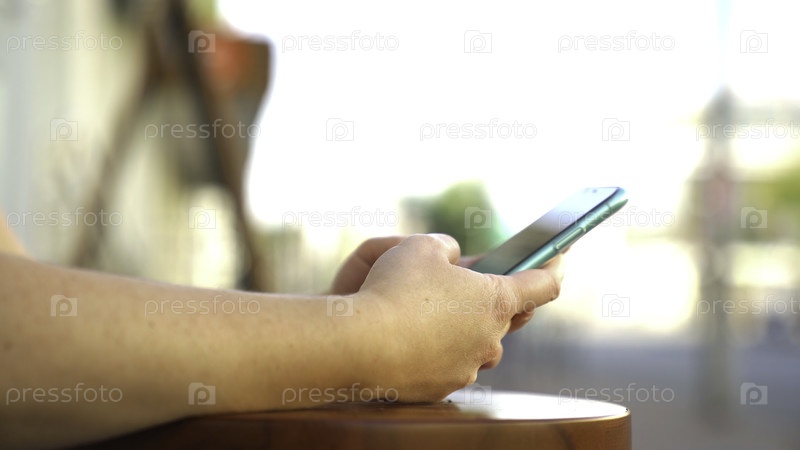 Боковой вид женских рук, держащих новый смартфон на размытом фоне городской улицы. ближайший снимок девушки, отправляющей сообщения или просматривающей свое современное электронное устройство на открытом воздухе