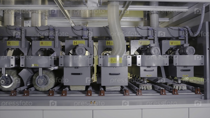Промышленные машины с вращающимися щетинами. действие. вращающиеся чешуйчатые сосуды разных размеров читают и красят деревянные доски на промышленных предприятиях