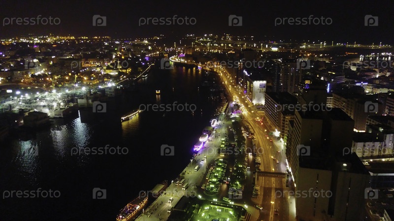 Фантастический ночной горизонт с освещенными небоскребами. Поднятый вид на центр Дубая, ОАЭ. Красочный фоновый фон путешествия. Прекрасный вид на ночь в Дубае со фонарями, рекой и ночной жизнью