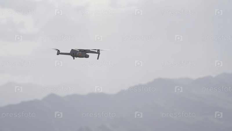 Квадрокоптер летает на фоне гор. Действие. Квадрокоптер летит и снимает красивые горные пейзажи. Квадрокоптер фотографирует зеленую горную долину