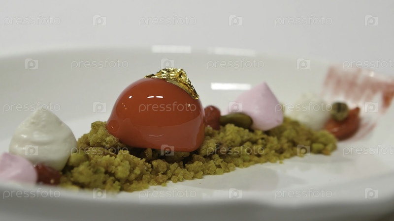 Десерт на тарелке на белом фоне Красивый вкусный десерт на тарелке Презентация десертов в Объединенных Арабских Эмиратах