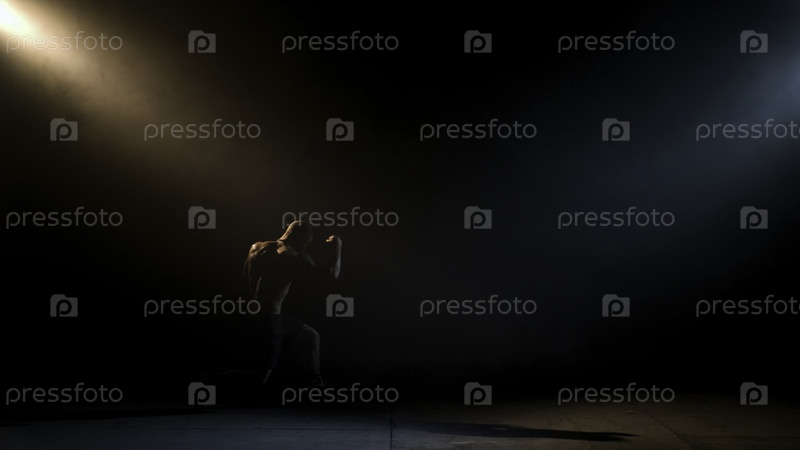 Боксер, занимающийся теневым боксом в темной комнате.Мужчина с атлетической фигурой делает удар.Драматическое освещение
