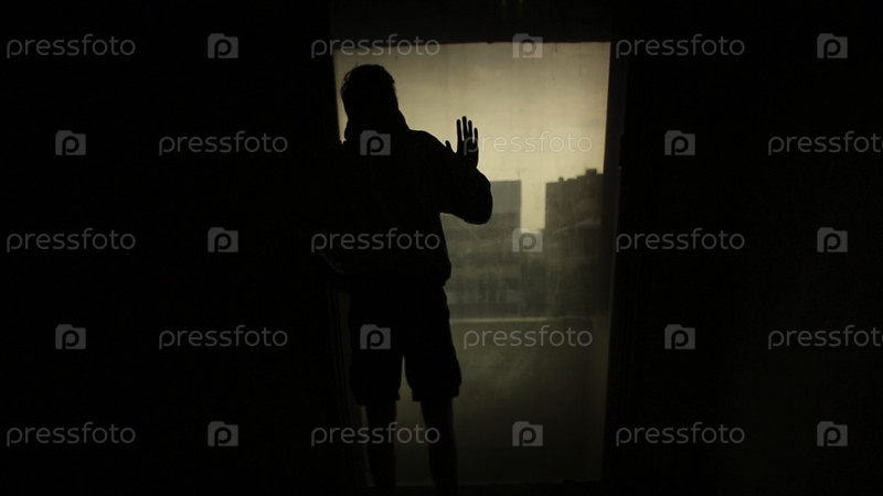 Силуэт мужчины, смотрящего в окно со светом в комнате. Кадры. Силуэт молодого одинокого человека в комнате. Понятие одиночества
