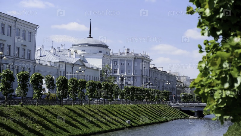 Прекрасный городской пейзаж с узким каналом и двумя склонами, покрытыми зеленой травой на фоне голубого облачного неба