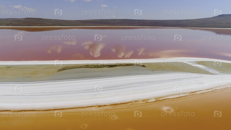 Вид сверху на облака, отражающиеся в розовом озере. Снимок. Ярко красочные оранжевые и розовые озера разделены белым берегом. Красивое отражение облаков и голубого неба в розовом озере