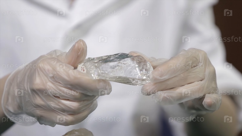 Дикий аметист в женских руках в белых перчатках. скальный камень в руках