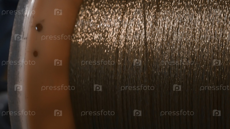 Ближайшее изображение вращающейся катушки с помощью медного провода.Креативное.Боббин поворачивает и наклоняет медный провод.Металлургическая промышленность и производство проводов
