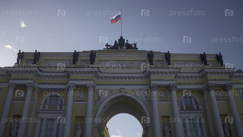 Вид снизу арки древнего архитектурного здания. Действие. Красивая арка древнего здания с размахивающим флагом на фоне голубого неба. Прекрасная старая архитектура с дугой в солнечный день