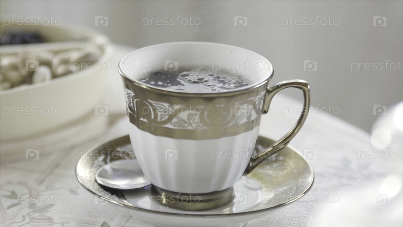 Ближайшее изображение элегантной фарфоровой чашки горячего чая с паром, стоящей на столе в светлой комнате